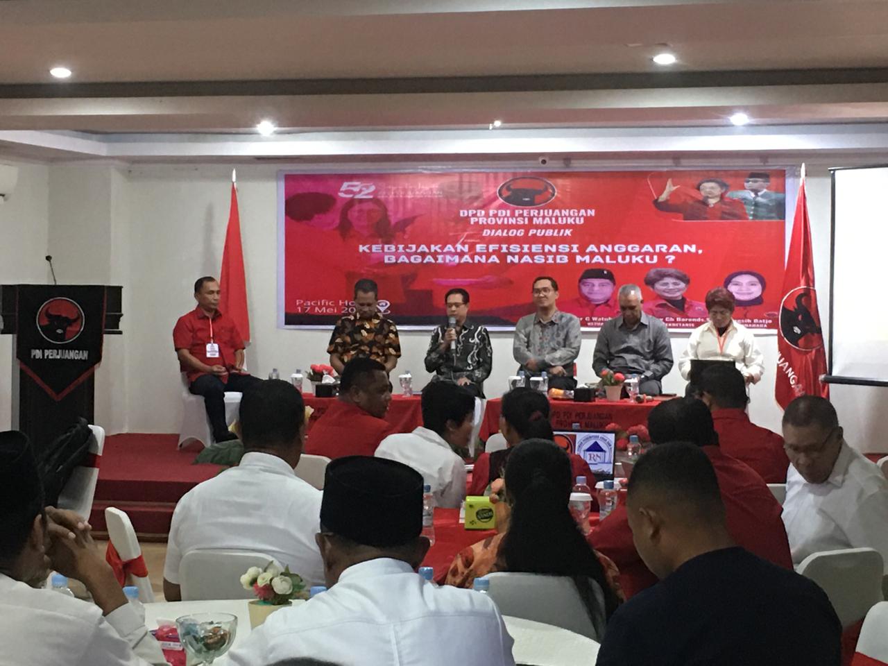 Ambon,Kapatanews.com._ Dewan Pimpinan Daerah (DPD) Partai Demokrasi Indonesia Perjuangan Maluku menggelar diskusi publik tentang efisiensi anggaran dan dampaknya terhadap Provinsi Maluku.