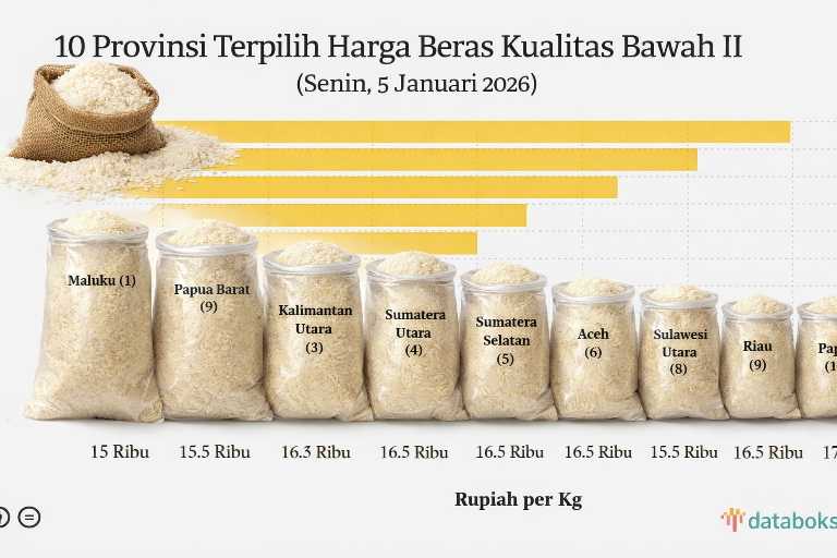 Di sisi lain, terdapat sejumlah provinsi dengan harga beras kualitas bawah II yang berada di bawah rata-rata nasional. Secara keseluruhan, tercatat 12 provinsi masuk dalam kelompok ini.