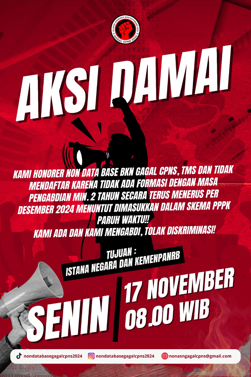 Maluku, Kapatanews.com – Aliansi Honorer Non-Database BKN Gagal CPNS Indonesia mengumumkan akan menggelar Aksi Damai Nasional di depan Istana Negara dan Kementerian PANRB, Jakarta, pada Senin, 17 November 2025.