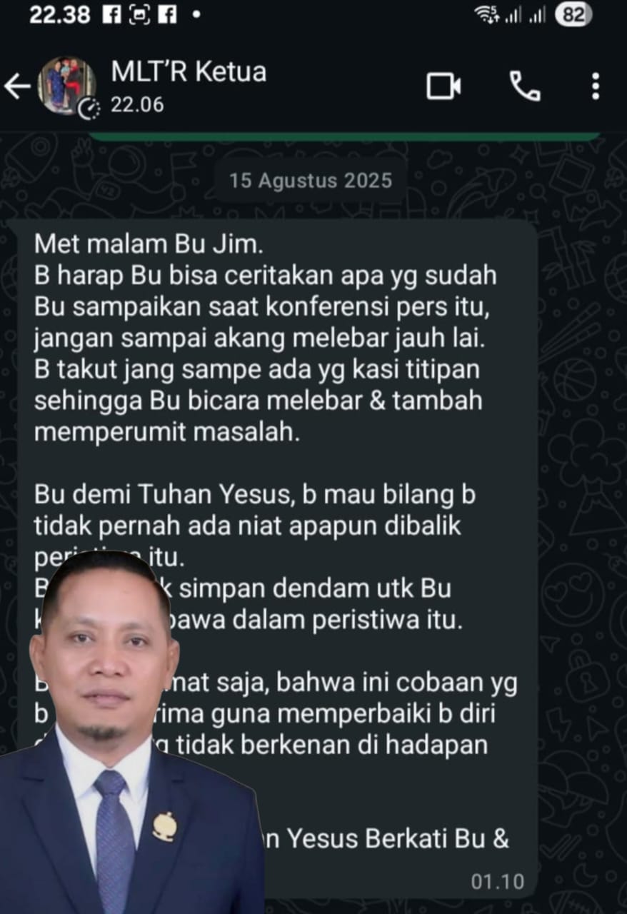 ” Met malam Bu Jim, B harap Bu bisa ceritakan apa yang sudah bu sampaikan saat konfrensi pers itu, jangan sampai akang melebar jauh lai. B takut jang sampe ada yang kasih titipan sehingga Bu bicara melebar & tambah memperumit masalah. Bu demi Tuhan Yesus, b mau bilang b tidak pernah ada niat apapun dibalik peristiwa itu. B juga tidak simpan dendam untuk Bu karna B terbawa dalam peristiwa itu. B ambil hikmat saja bahwa ini cobaan yang b harus tarima guna memperbaiki b diri dari hal2 yg tidak berkenan dihadapan Tuhan. Danke banyak Tuhan Yesus Berkati Bu & keluarga selalu”