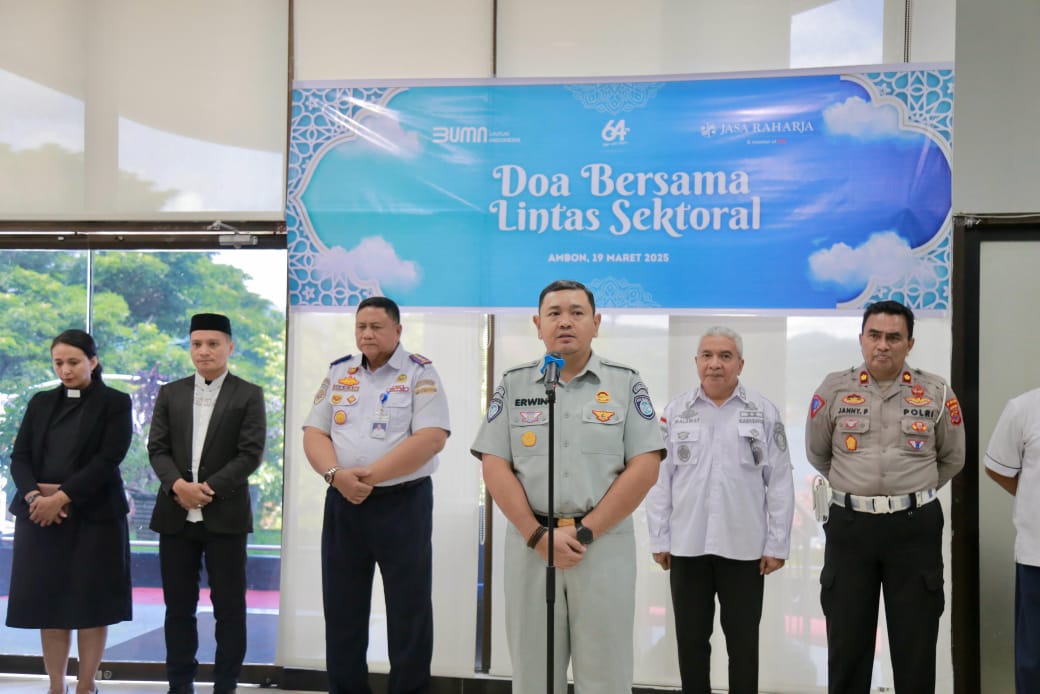 Ambon, Kapata News — Dalam rangka memohon perlindungan dan keselamatan bagi masyarakat yang akan melakukan perjalanan mudik serta pengamanan PAM mudik Lebaran 1446H Tahun 2025, PT Jasa Rahrarja Kantor Wilayah Maluku menggelar doa bersama dengan seluruh instansi terkait, di Kantor Jasa Raharja, Rabu, (19/3).