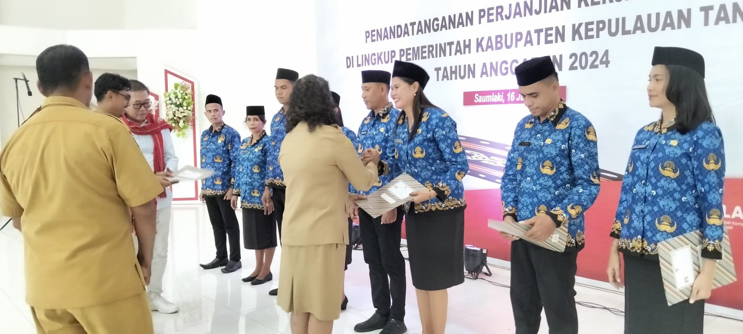 Saumlaki, Kapatanews.com – Wakil Bupati Kepulauan Tanimbar, dr. Juliana Ch. Ratuanak, secara resmi menyerahkan Surat Keputusan (SK) pengangkatan Calon Pegawai Negeri Sipil (CPNS) dan Pegawai Pemerintah dengan Perjanjian Kerja (PPPK) tahun anggaran 2024. Acara penyerahan SK dan penandatanganan perjanjian kerja tersebut berlangsung di Gedung Natar Kaumpu, Saumlaki, pada Senin (16/6), dan dihadiri oleh unsur pimpinan daerah serta ASN penerima SK.