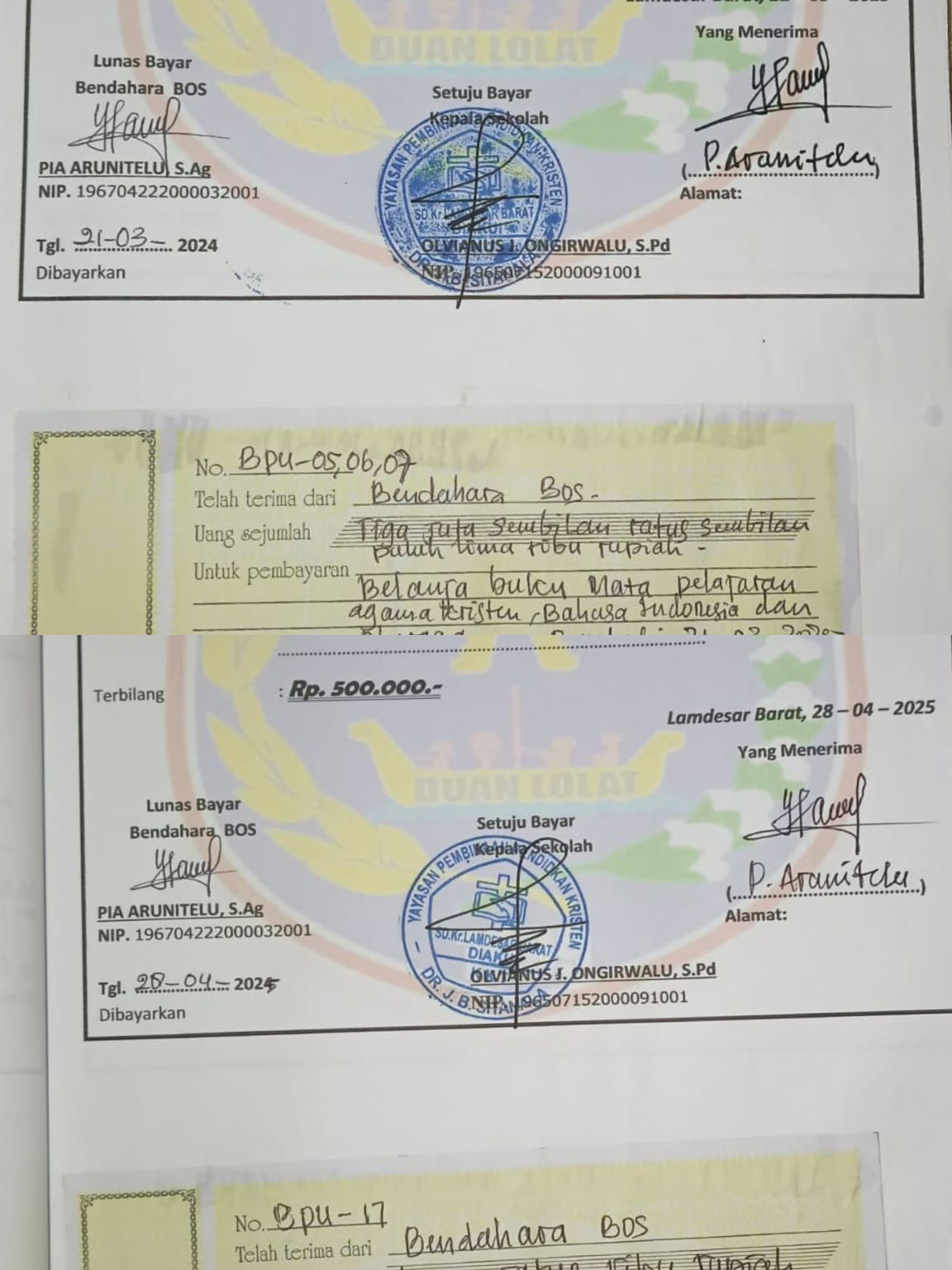 Selain itu, AB mengaku menemukan namanya tercantum dalam kwitansi pembayaran tenaga operator sekolah. Dokumen tersebut, menurutnya, tercantum dalam LPJ Dana BOS Tahun Anggaran 2025.
