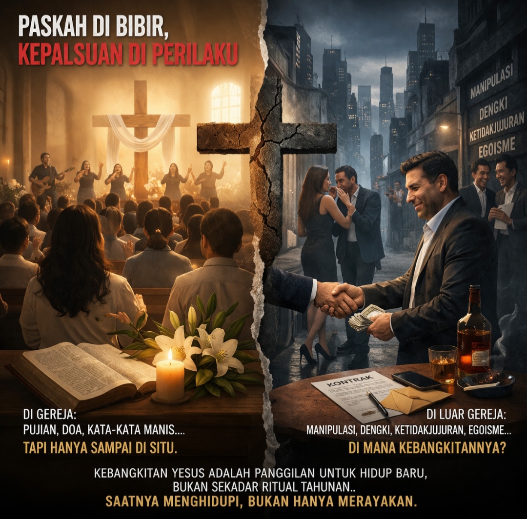 Sebab ketika kata dan perbuatan tidak lagi berjalan seiring, maka yang dipertaruhkan bukan hanya integritas pribadi, tetapi juga kredibilitas iman itu sendiri. Paskah kehilangan maknanya ketika kebangkitan hanya menjadi narasi, bukan realitas.